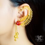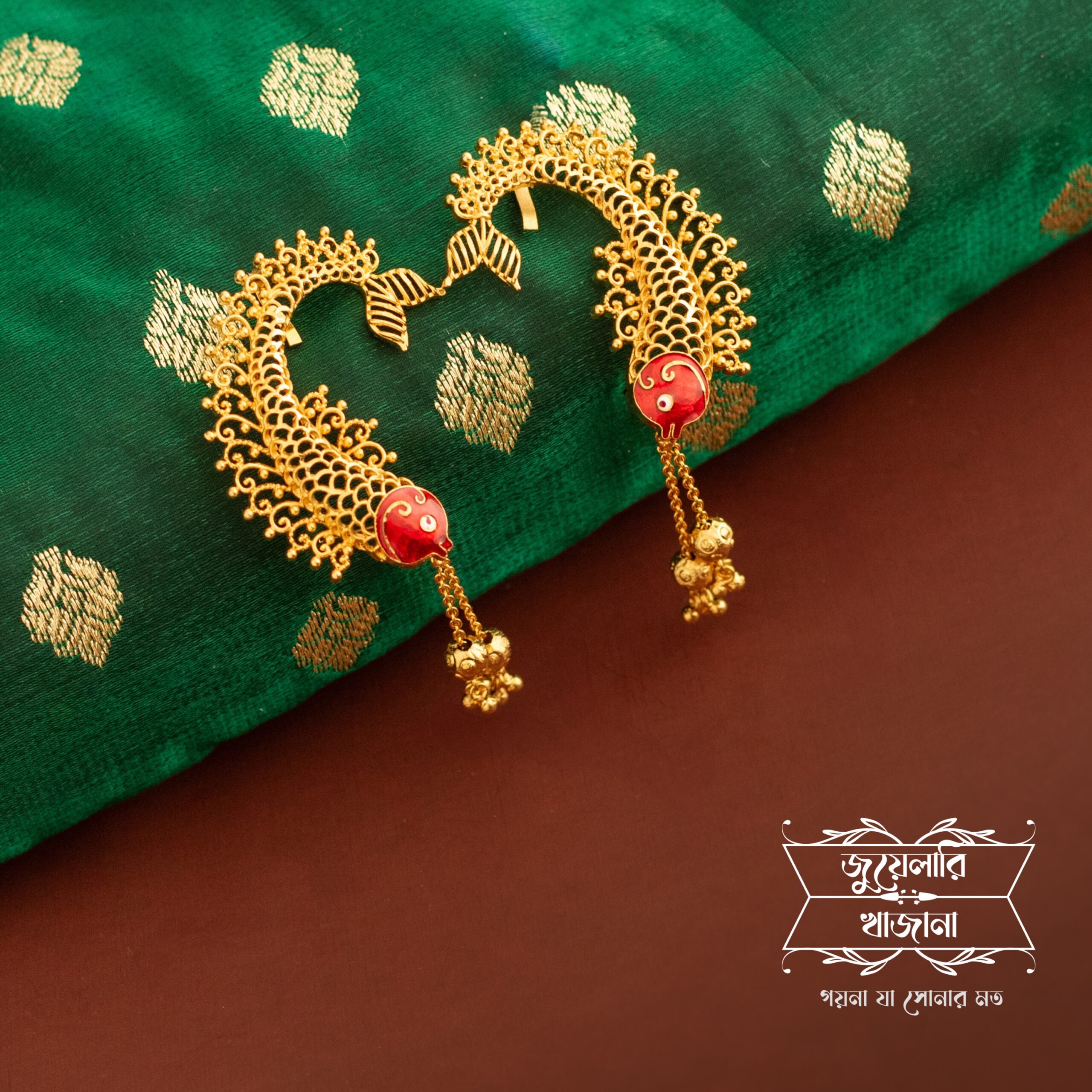 Celebrate tradition with a twist of elegance in the Premium Gold Plated Meenakshi Full Kaan. Designed with the iconic Bengali full-ear silhouette, this stunning piece features delicate fish-inspired motifs, symbolizing prosperity and feminine charm. The vibrant red enamel accents add a graceful pop of color, while intricate filigree work captures the essence of timeless craftsmanship.